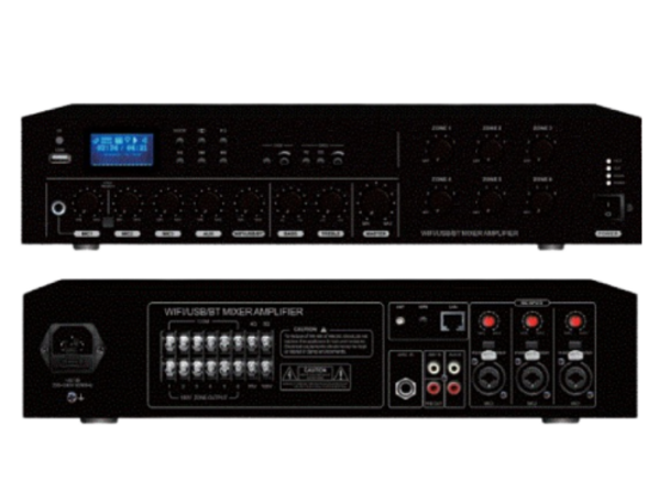 Описание FY-240W 6 Zone Wi-Fi Mixer Amplificator Микшер-усилитель мощностью 240 Вт. с USB/SD/TUNER Bluetooth и WiFi Встроенный беспроводной приемник потоковой передачи музыки WiFi, приемник Bluetooth и USB-плеер. Подключение к вашему смарт-устройству через бесплатное приложение. Поддержка AIRPLQY/D LAN/Q PLAY. Один порт RJ45 доступен для точки, где сигнал WiFi слабее. Выходные нагрузки 70/100 В и 4/8 Ом (%3F). 5 зон 100 В выходов динамиков с отдельным переключателем ВКЛ/ВЫКЛ. Мощные усилительные лампы. Три разъема фантомного питания 48 В, подходящие для несбалансированного микрофона со штекером 6,35 мм. Микрофон 1 имеет приоритет над входами. Дисплей высокой четкости для отображения рабочего состояния воспроизводимой программы. Встроенная схема звонка и сирены с кнопкой и регулятором громкости. Регуляторы тембра BASS и TREBLE. Регулятор громкости. Полная защита от короткого замыкания на выходе, перегрузки, высокой температуры. В комплект входят съемные кронштейны для монтажа в стойку. Потребляемая мощность 350Вт. Размеры 100 х 430 х 340мм.