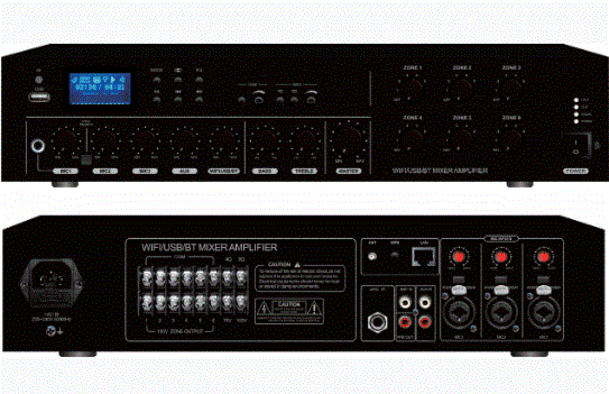FY-350W 6 Zone Wi-Fi Mixer Amplificator Встроенный беспроводной приемник потоковой передачи музыки WiFi, приемник Bluetooth и USB-плеер. Подключение к вашему смарт-устройству через бесплатное приложение. Поддержка AIRPLQY/D LAN/Q PLAY. Один порт RJ45 доступен для точки, где сигнал WiFi слабее. Выходные нагрузки 70/100 В и 4/8 Ом (Ω). 5 зон 100 В выходов динамиков с отдельным переключателем ВКЛ/ВЫКЛ. Мощные усилительные лампы. Три разъема фантомного питания 48 В, подходящие для несбалансированного микрофона со штекером 6,35 мм. Микрофон 1 имеет приоритет над входами. Дисплей высокой четкости для отображения рабочего состояния воспроизводимой программы. Встроенная схема звонка и сирены с кнопкой и регулятором громкости. Регуляторы тембра BASS и TREBLE. Регулятор громкости. Полная защита от короткого замыкания на выходе, перегрузки, высокой температуры. В комплект входят съемные кронштейны для монтажа в стойку. Потребляемая мощность: 485Вт. Размеры 100 х 430 х 340мм. Гарантия 2 года.