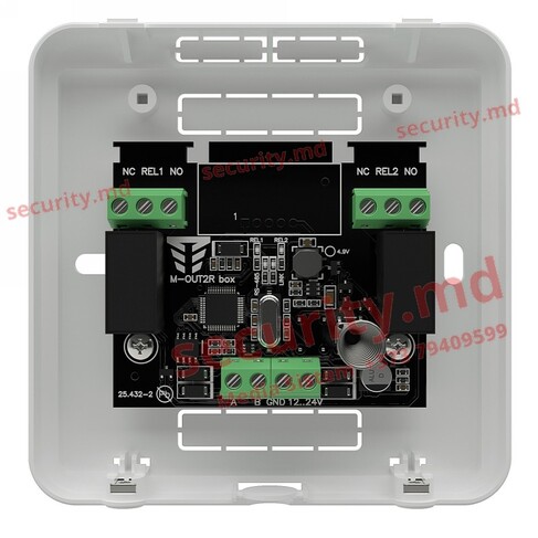 M-OUT2R box используется для увеличения релейных выходов в системе с возможностью их уноса от ППК на расстояние до 1000 м. Это будет полезным для подключения автоматики в отдаленных частях объекта – другой этаж, другое здание и т.д. Таким образом, можно уменьшить количество проводов и оптимизировать топологию системы. Особенности: Два релейных выхода Пластиковый корпус со световым индикатором-логотипом Защита от открывания корпуса и отрыва от места установки Подключение по системной шине RS-485 с длиной линии до 1000 м Технические параметры: СОВМЕСТИМОСТЬ Orion NOVA L Orion NOVA M СВЯЗЬ К ППК Системная шина RS-485 с криптозащищенным обменом Витая пара 5 категории или выше Длина линии связи до 1000 м ВЫХОДЫ Два релейных выхода 10А/230В (AC), 5А/30В (DC) ПИТАНИЕ Наружное питание: 12 В Потребление без дополнительных внешних нагрузок: реле модуля деактивировано: 30 мА реле модуля активировано: 100 мА КОРПУС Габаритные размеры: 100х100х30 мм Масса: 120 г Степень защиты корпуса: IP30 Диапазон рабочих температур: от -10°C до +40°C
