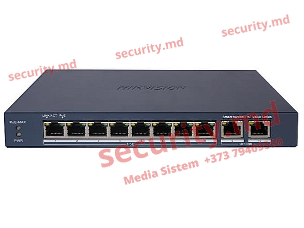 Switch PoE+ pentru monitorizare SMART de birou. Putere și semnal de transmisie până la 300m. 8 porturi 10/100Mbps PoE + 2 porturi Gigabit uplink. Sarcina maximă pe port - 30W. Sarcina totală pe POE - 60W. Vizualizați topologia rețelei, afișați starea rețelei (health monitor), statistici de viteză, trafic, sarcina pe linie. Primiți alarme, repornirea de la distanță a comutatorului sau a unuia dintre porturi, Live View de la camere, jurnale. Cablul Ethernet pinout 1/2/3/6 și 4/5/7/8 pe toate porturile Poe asigură transmiterea simultană a puterii pe 4 nuclee. Activarea modului Extend prin IVMS. Protecție la trăsnet de 6kV. Debit de 9,6 Gbps. Suportă IEEE802.3af & IEEE802.3at. Sursă de alimentare 54 VDC, 1,2 A. Dimensiuni 218x109x28mm. Interval de temperatură de la 0°C la 40°C. Design fără ventilator. Proiectat special pentru sisteme de supraveghere video. Garanție 3 ani!